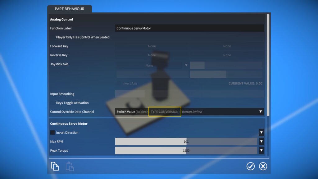 - For controllable parts the “invert direction” tweakable now takes effect even when key / joystick control is overridden by a linked data channel.