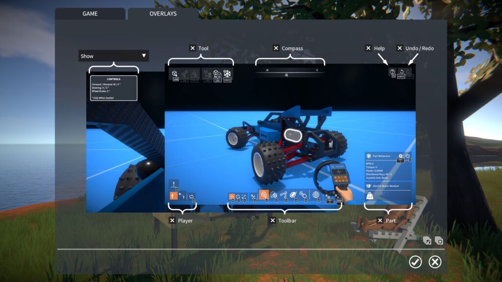 This includes an optional time-out to hide the “construction controls” overlay, configured in OVERLAYS panel.