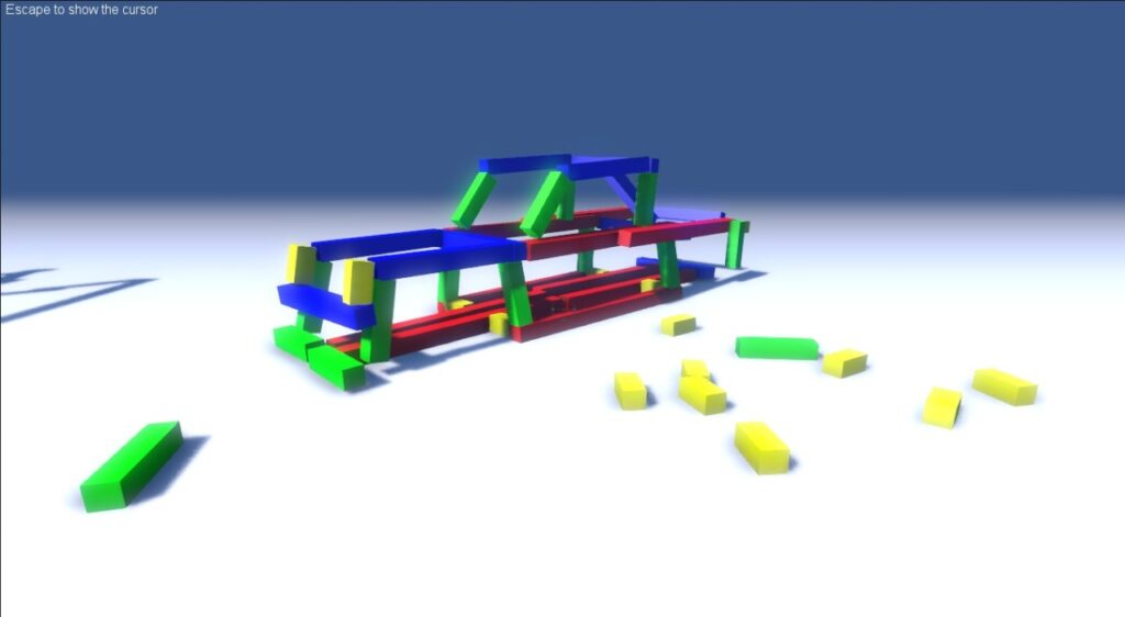 Alright! Here’s a playable demo of my construction game. Once it’s loaded, to play, just select Start New Server, then select one of the levels. There are hints at the bottom of the screen for the controls, and you can hit escape at any time to get your mouse cursor back.