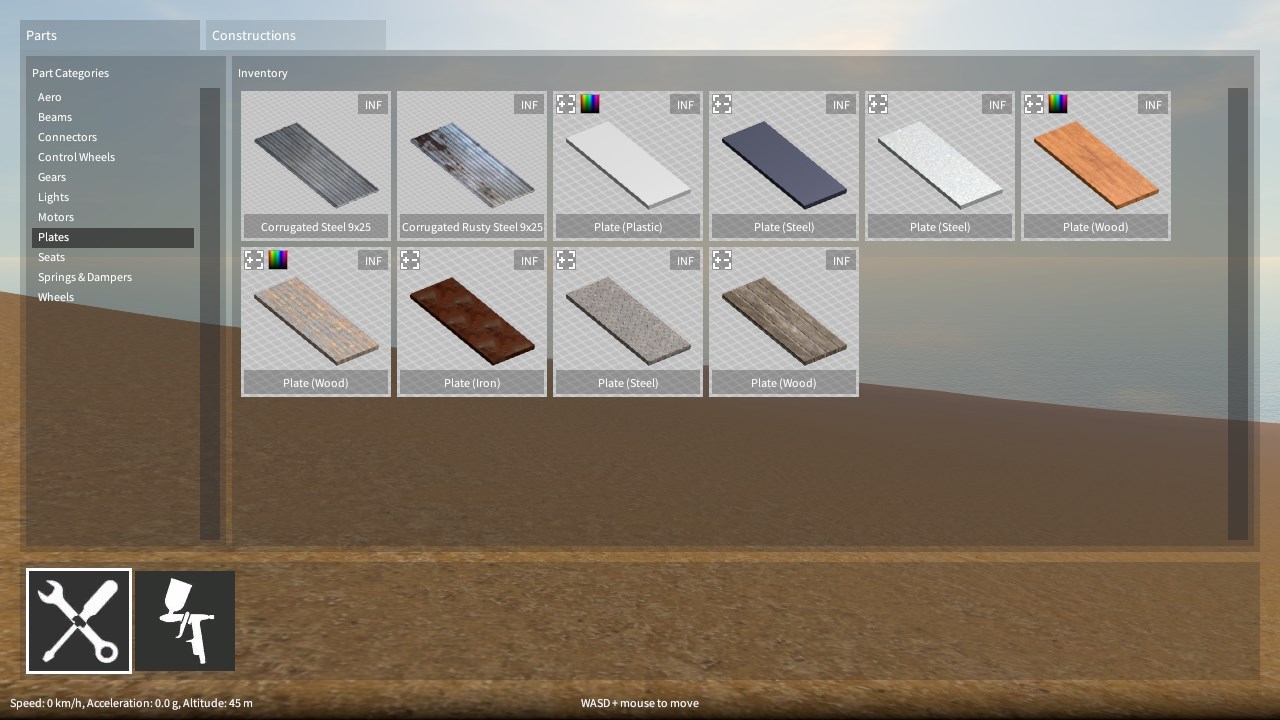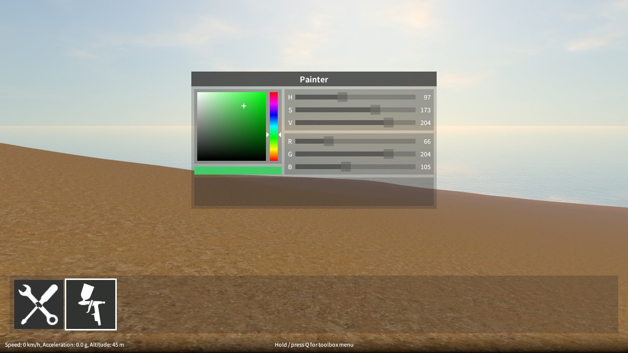 The numeric keys select which tool is currently active, 1 for the builder tool (i.e. the pre-existing construction controls) and 2 for the new painter tool. The currently active tool is indicated in a new toolbar at the bottom of the screen (you can also select a tool by clicking on the icons in this toolbar). When the builder tool is active, using Q will bring up the part spawner menu as before, but when the painter tool is active, Q brings up a different menu, one that lets you choose a colour to paint with. Note that in the demo, some of the paint colour controls in this menu are disabled, but you can still choose from a fixed palette of colours.