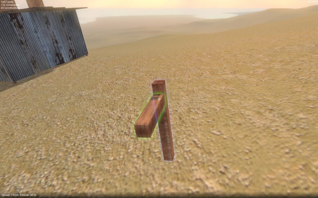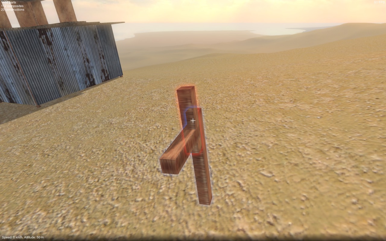 - Construction tool. Currently there is nothing to give a sense of agency for the player, of course in an FPS you’d typically have an arm holding a gun in front of the camera, I need some equivalent of this. It would be difficult to make the players arms convincingly appear to directly hold the parts they pick up, so in place of the usual FPS gun I think I need some kind of beam effect manipulator tool (much like the physics gun in Garry’s Mod).